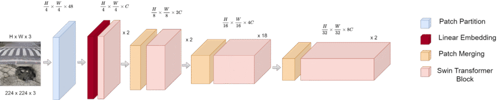 A patch splitting module first divides the input image in non-overlapping patches in a way that Vision Transformer follows in figure 13. Each patch of data is regarded as a “token,” with its feature set to be a concatenation of the RGB values of the individual pixels. The feature is further projected to an arbitrary dimension which is referred to as C with the help of a linear embedding layer.